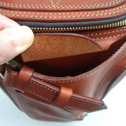 表ポケットはデザイン兼、脱落防止のベロがつき、写真左側の金具部分でベルトの長さを調整することで開閉口のサイズを大きく出来ます。入れる物によって大きくしたり小さくしたりの調整が可能です。 |