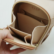 本体上部にはストレートファスナーポケットがつきます。内側にはピッグスキンをはり、強度および指を滑らせた際の触り心地も考慮しています。カード類等入れるのに丁度いい深さです。